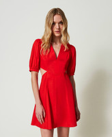 Robe courte en popeline de coton avec découpes géométriques et ajours sur les côtés, encolure en V et manches courtes avec emmanchure froncée.