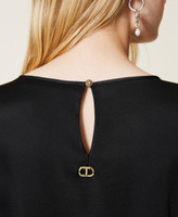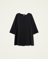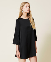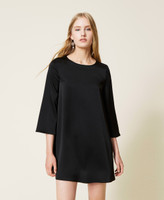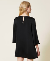 Robe courte unique en cady envers satin brillant avec col rond, manches 3/4 et bouton en métal dans le dos.