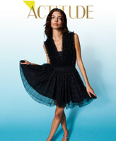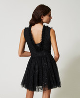 Robe courte de la collection Actitude en tulle brodé de sequins et d’un fil à carreaux, avec volant sur les épaules, fermeture éclair sur le côté et doublure.