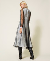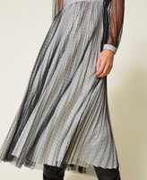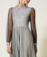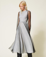 Robe longue en tulle plumetis avec jupe plissée soleil, manches transparentes, fermeture éclair sur le côté et doublure en crêpe de Chine.