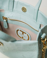 À la main ou en bandoulière ? C’est vous qui décidez comment arborer le sac à bandoulière « Lou Lou » made in Italy réalisé en cuir de veau italien pleine fleur avec imprimé croco. Il présente une forme de mini tote bag avec double anse, une bandoulière en chaîne amovible dotée d’une épaulette en cuir, une fermeture éclair et le logo Oval T émaillé assorti. Un modèle inédit pour une occasion spéciale.