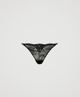 String en dentelle festonnée à la taille, avec élastiques siglés sur les côtés et cœur siglé en métal orné d’un nœud en satin et dentelle à l’arrière.