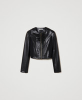 Blouson cropped en effet cuir et point de Milan avec épaules structurées, manches bouffantes, fermeture éclair et motif de volants à bord franc sur le devant.