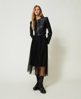 Le manteau le plus populaire de la saison est ce blouson cropped effet cuir avec encolure ras-du-cou, épaules structurées qui définissent la silhouette et manches longues bouffantes. Sa coupe cintrée est rythmée par des insertions en point de Milan sur les côtés et sous les manches et par une série de volants à bord franc autour de la fermeture éclair. La tirette siglée et la doublure intérieure en crêpe de Chine stretch complètent cette pièce qui se coordonnera avec tout votre dressing.