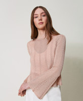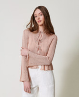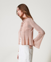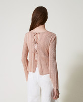 Cardigan double usage (il peut se porter des deux côtés) en maille mélangée de viscose et lurex. Il présente une finition ajourée qui alterne avec des côtes et un point jersey, un col rond, des manches longues, une fermeture à lacets et une coupe fluide.