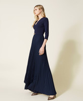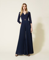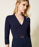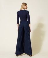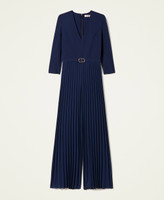 Combinaison en point de Milan stretch et crêpe de Chine plissé, avec encolure en V et logo métallique à la taille.