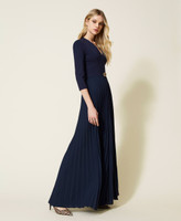 Si vous recherchez une alternative inédite à la robe longue, vous pouvez compter sur cette combinaison en point de Milan stretch avec partie inférieure en crêpe de Chine plissé soleil. Elle présente une coupe près du corps plus ample dans le bas, une encolure en V, de fines manches 3/4, une taille marquée avec Oval T en métal, une fermeture éclair sur le côté et une étiquette siglée dans le dos. Il suffit d’ajouter une pochette et des talons hauts pour compléter le style.