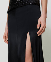 Jupe longue non doublée en satin opaque de viscose construite avec des pans verticaux évasés dans le bas et une grande fente latérale.