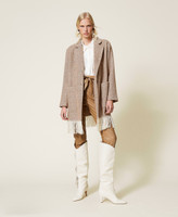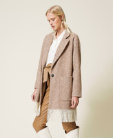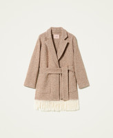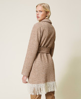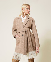 Manteau court modèle robe de chambre en drap de laine avec motif chevrons, bas frangés et ceinture.