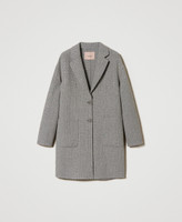 Manteau en drap double de laine mélangée avec fines rayures créées par de petits sequins dorés. Non doublé, il présente une construction épurée et des coutures intérieures plates, un col à revers, une fermeture boutonnée assortie, des manches longues et des épaules légèrement tombantes, des poches, une étiquette siglée Oval T dans le dos et une coupe droite resserrée dans le bas.