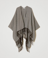 Poncho ouvert en drap avec motif chevron, lurex et franges.