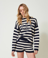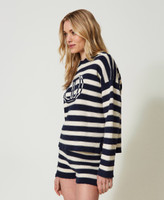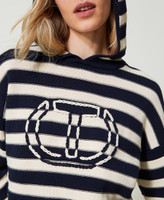 Les indémodables rayures dans le style Twinset. Ne passez pas à côté du pull made in Italy avec rayures bicolores, logo Oval T central brodé au crochet à la main, col à capuche, manches longues avec épaules basses et coupe fluide. Parfait avec le short coordonné, il arbore un charme marin qui apportera une touche raffinée à n’importe quel look.