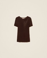 Pull made in Italy en viscose stretch tricotée en grands chevrons effet transparent avec des fils flottants. Il présente un col rond, des manches courtes et une coupe ajustée.
