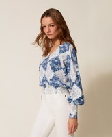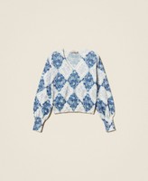 Pull en fil de coton avec finition en point jersey et imprimé floral placé en losanges. Il présente une encolure en V, des manches longues, des bords-côtes et une coupe fluide.