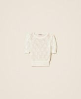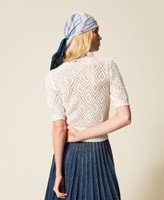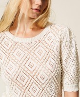 Pull en fil de coton avec finition ajourée en losanges et perles rivetées appliquées. Il présente un col rond, des manches courtes, des bords-côtes et une coupe fluide.