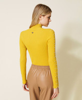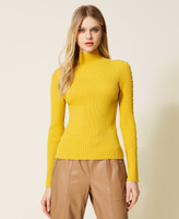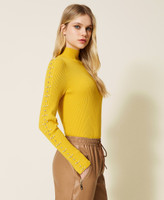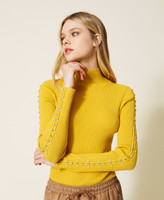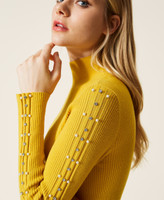 Pull col montant en viscose mélangée côtelée avec perles et strass sur les manches, coupe ajustée.