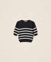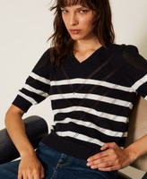 Pull avec 90 % de coton biologique certifié et cachemire, finition ajourée en parallèle sur une base en point jersey et rayures bicolores. Il présente une encolure en V, des manches courtes, des bords-côtes et une coupe fluide. Les éventuelles petites impuretés sont propres aux matières recyclées et biologiques.