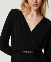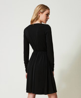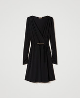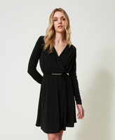 Robe courte en jersey interlock au toucher crêpe effet portefeuille avec col croisé, jupe froncée et ceinture siglée assortie.