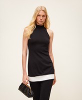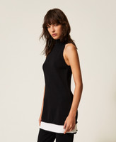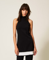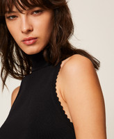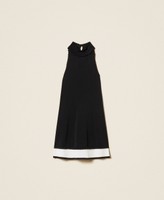 Robe courte en maille de viscose stretch bicolore à la une texture compacte avec bords rehaussés de festons de différentes tailles. Elle présente une encolure américaine, une coupe ajustée et un bas évasé.