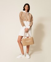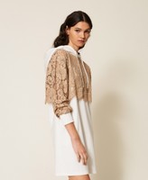 Robe courte en molleton de coton et dentelle festonnée. Elle présente un col à capuche doublée de dentelle, avec cordon de serrage et embouts en métal doré, des manches longues transparentes, des poignets côtelés, des épaules tombantes, un cœur siglé en métal sur le devant et une coupe fluide.