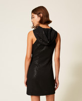 Robe courte signée par l’artiste MYFO pour la collection Actitude en tissu entièrement orné de sequins et doublé de crêpe georgette. Elle présente une encolure américaine, une capuche, une doublure intérieure et une coupe ajustée.