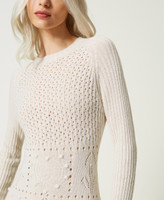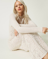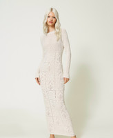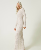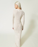 Robe longue ajustée made in Italy, réalisée en collaboration avec Marco Rambaldi, en fil Treeblend. Réalisée en maille sans coutures, elle arbore une finition inspirée des trames au crochet avec mélange d’ajours, de côtes, de points en relief et de motifs placés de cœurs, de feuilles et de fleurs. Elle présente un col rond, des manches longues raglan, un fond de robe amovible doté de bretelles réglables, une étiquette siglée jacquard et une étiquette avec logo Oval T en maille, toutes les deux réalisées dans le même fil que la pièce. Le projet TREEBLEND a pour objectif de réduire les émissions de CO2 par rapport aux processus de production traditionnels de la maille : -20 % de réduction attendue.