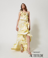 Robe longue de la collection Actitude en mousseline de coton avec imprimé de roses all-over, application de roses réalisées à la main et construction avec volants escargot. Elle présente des bretelles spaghetti, un empiècement élastique à la taille, une fente latérale, un corsage doublé et une coupe ample.