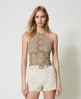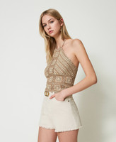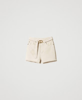 Un charme quotidien avec du caractère pour ce short en bull de coton teint en pièce, rehaussé de légères abrasions et d’un bord franc dans le bas avec surpiqûre linéaire. Il présente une coupe droite, une taille haute, une fermeture éclair avec bouton, cinq poches et des rivets siglés Twinset. Avec une blouse ou un t-shirt selon l’occasion.