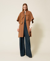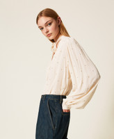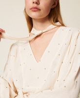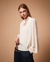 Blouse en tissu avec broderie à pois en lurex, encolure en V sur le devant rehaussée de rubans à nouer, manches longues avec poignet et fronce dans le bas, coupe fluide.