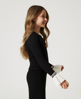 Enrichissez le répertoire maille de votre fille grâce à cet ensemble en fil de viscose mélangée côtelée. Il se compose d’un cardigan, fermé par une broche en métal ornée d’une inscription siglée, avec volant godet et motif géométrique, et d’un top débardeur ajusté. À porter sur un jean ou une jupe élégante.