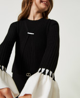Ensemble en fil de viscose mélangée côtelée, composé d’un cardigan rehaussé d’une broche siglée et de volants godets dans le bas et d’un top débardeur ajusté.