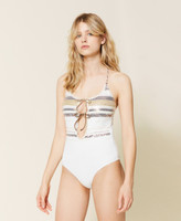 Maillot de bain une pièce non ampliforme avec encolure en goutte, lacets, bandes brodées en sequins, fil lurex et clous.