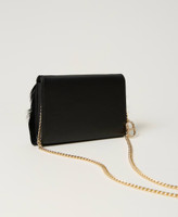 Pochette avec double rangée de plumes, fermeture à rabat et aimant, bandoulière en chaîne rehaussée d’un pendentif Oval T strassé.