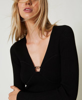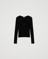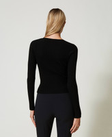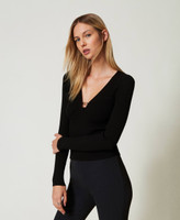 Pull en viscose mélangée stretch avec finition côtelée, profonde encolure en V rehaussée du logo Oval T en métal, bonnets profilés, manches longues et coupe ajustée.