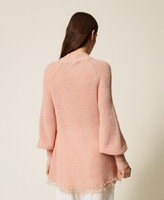 Pull col montant avec finition en côte perlée et motif de franges et de perles dans le bas. Il présente des manches longues et fluides, dotées de grands poignets, une étiquette métallique siglée en forme de cœur dans le dos et une coupe fluide.