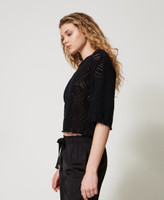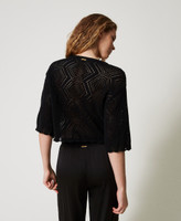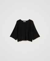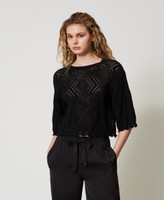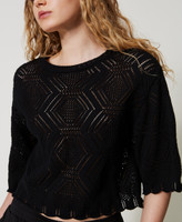 Pull ras-du-cou en coton ajouré avec manches 3/4 amples, étiquette siglée dans le dos et coupe droite.