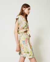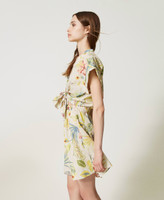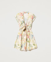 Robe courte en popeline de coton imprimée effet double pièce avec nœud central, ouverture et jupe dotée d’une taille élastique.