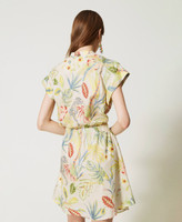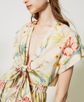 Effet double pièce pour la robe courte en popeline de coton avec imprimé d’inspiration exotique, une exclusivité Twinset. Elle présente un bustier modèle top avec col Mao en V sur le devant, des mancherons et une ouverture dotée d’une jupe fermée à la taille par un élastique. Une mini-jupe tendance parfaite en vacances comme en ville.