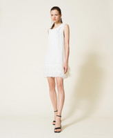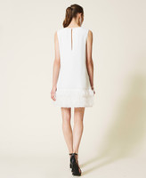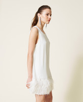 Robe courte de la collection Actitude en satin avec larges bretelles, trois rangées de plumes cousues, logo avec sequins.