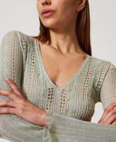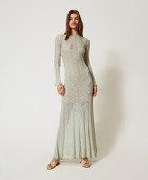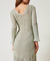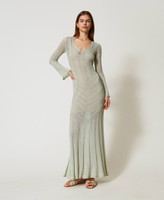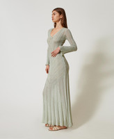 Robe longue double usage (elle peut se porter des deux côtés) en mélange de viscose et lurex. Elle présente une finition ajourée qui crée des motifs all-over, une encolure en V d’un côté et une encolure bateau de l’autre, des manches longues, un fond de robe assorti et une coupe ajustée.