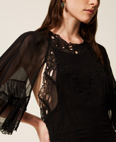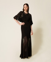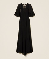Robe longue en crêpe georgette de viscose avec broderie florale placée en fil, un motif exclusif Twinset. Elle présente un col rond profilé d’une broderie, des manches courtes en cape avec double volant froncé, une fermeture avec rubans à l’arrière du col, une fermeture éclair dans le dos, un fond de robe en crêpe georgette et une coupe droite.