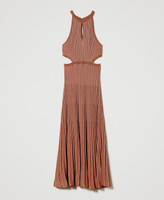 Robe longue en maille mélangée de viscose et lurex avec finition plissée effet rayures, ouverture en goutte sur le devant et ajours sur les côtés.