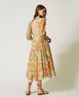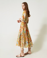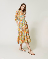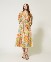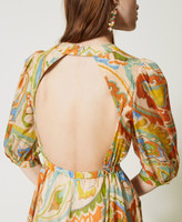 robe longue en tissu italien de mousseline de coton rehaussée d’un imprimé exclusif Twinset, évoquent les épices. Elle présente une coupe fluide, une encolure en V, des manches 3/4 amples et froncées aux emmanchures, une taille réglable grâce à un élastique revêtu, une jupe ample et évasée, un dos dénudé avec encolure fermée par un bouton, une doublure en voile de coton et une étiquette siglée Oval T dans le dos. Elle sera parfaite du matin au soir.