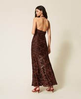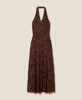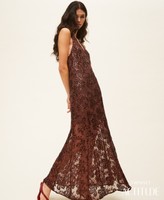 Robe longue de la collection Actitude en tulle avec broderie de sequins all-over. Elle présente une encolure américaine, une fermeture boutonnée à l’arrière du cou, une grande encolure dans le dos, une doublure, une fermeture éclair sur le côté et une coupe ajustée et évasée.