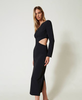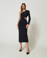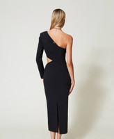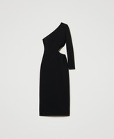 Robe midi asymétrique en crêpe stretch technique performant, qui souligne et façonne la silhouette avec élégance. Elle présente une manche longue, un ajour et une fronce sur le côté, une fermeture éclair, une jupe droite avec fente dans le bas du dos et une coupe ajustée.