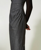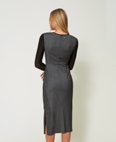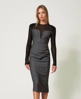 Robe midi de la collection Actitude teinte fil rayée avec empiècement et manches en tulle, fermeture éclair et coupe ajustée.