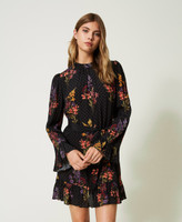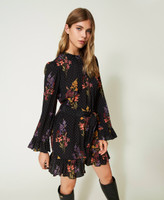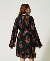 abito corto in crêpe di viscosa italiano stampato con disegno esclusivo Twinset che unisce pois all over e una fantasia bouquet che attinge alla tradizione dei giardini botanici inglesi. Linea dritta, collo tondo, maniche morbide con volant arricciati al fondo, chiusura con bottoni ricoperti e apertura a goccia sul retro, sfoderato. Lo puoi indossare con o senza la cintura in coordinato. Perfetto per un’occasione speciale completato da pochette e bijoux scenografici.