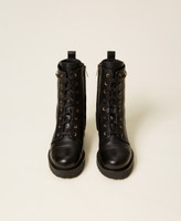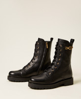 Anfibi in pelle con inserto in catena e Oval T in metallo al fianco, zip laterale, lacci davanti e fondo in gomma.