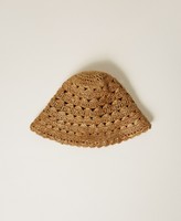 Cappello bucket made in Italy effetto rafia con lavorazione a crochet e placchetta logo lettering.