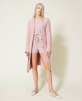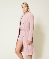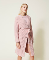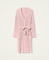 Cardigan lungo in ciniglia a coste con bottoni in tono logati, tasche applicate, cintura rimovibile, profili a costine.